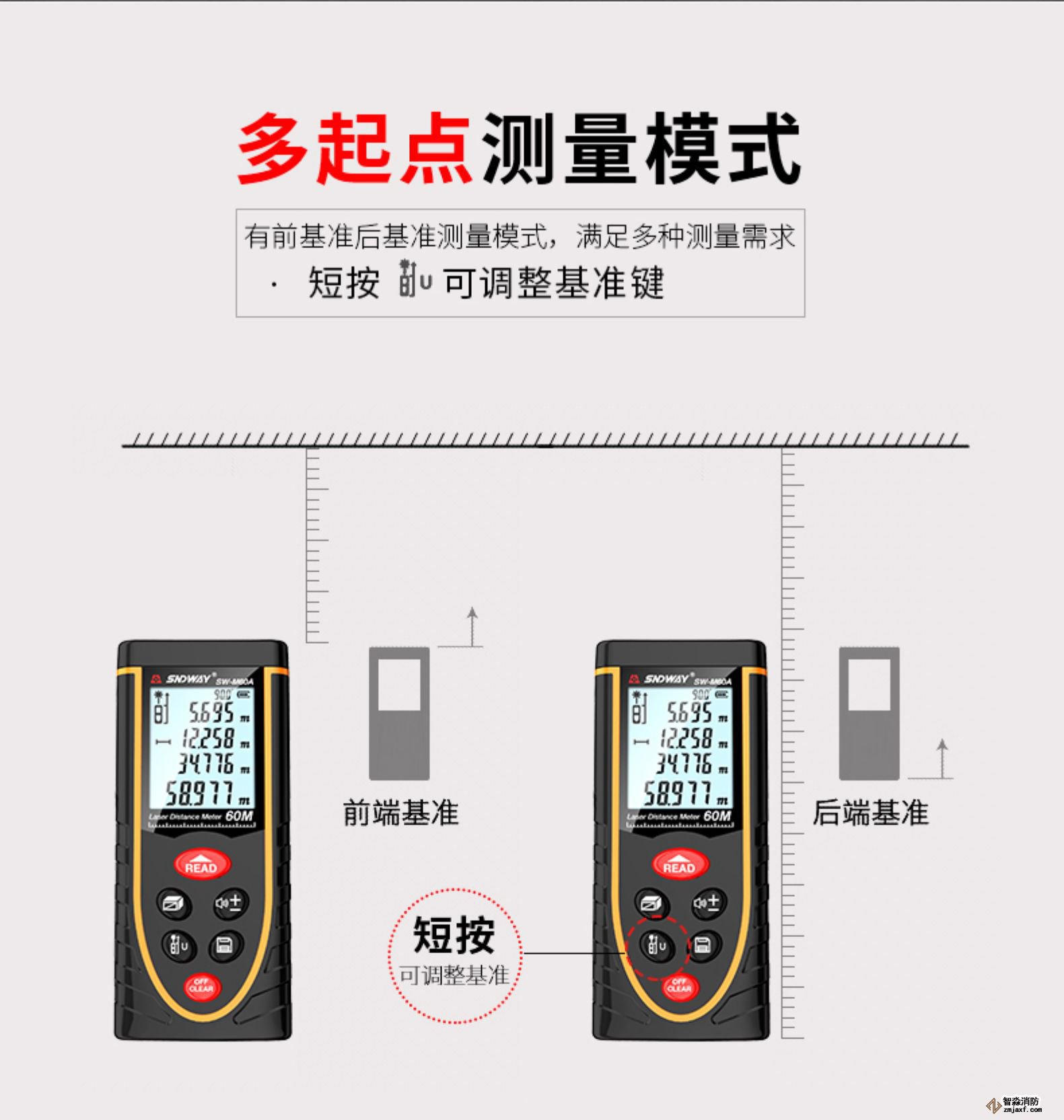 將激活的激光瞄準目標區域;輕按“測量”鍵;設置測量距離。設備立即顯示結果。