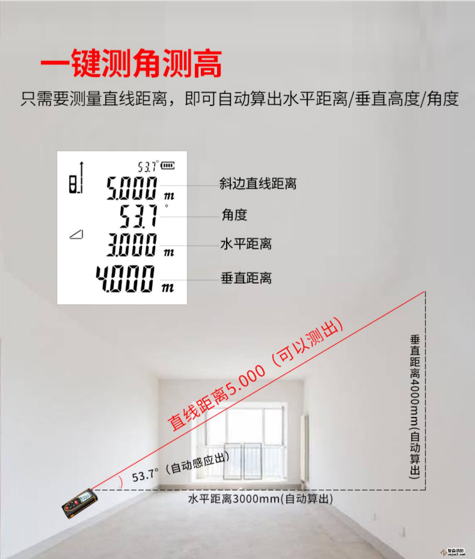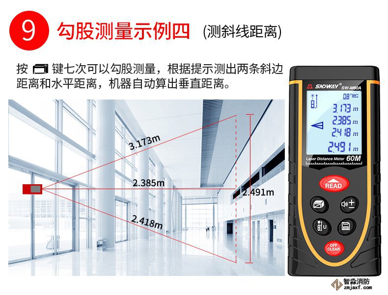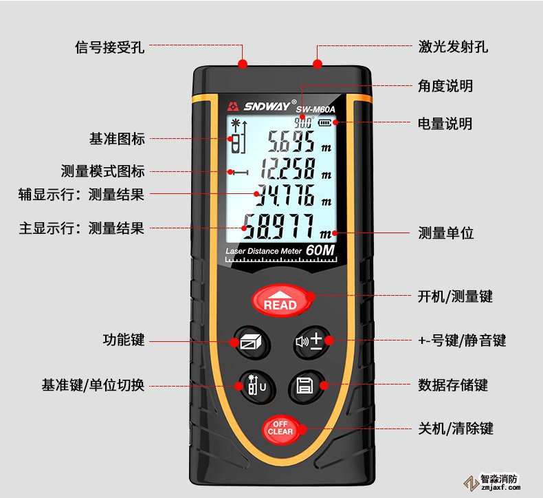 測距儀是測量距離的工具,從測距基本原理,可以分為激光距儀、超聲波距儀和紅外距儀三類。激光測距儀是目前使用最為廣泛的測距儀,是利用激光對目標的距離進行準確測定的儀器。激光測距儀在工作時向目標射出一束很細的激光,由光電元件接收目標反射的激光束,計時器測定激光束從發射到接收的時間,計算出從觀測者到目標的距離,圖4-1。消防檢測設備:WWW.XDJYQ.COM
