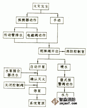 1—水泵接合器;2—高位水箱;3—進水管;4—雨淋閥;5—傳動管;6—閉式噴頭;7—手動閥;8—排水管;9—進水和;10—水池;11—開式噴頭;12—消防泵,13—控制箱