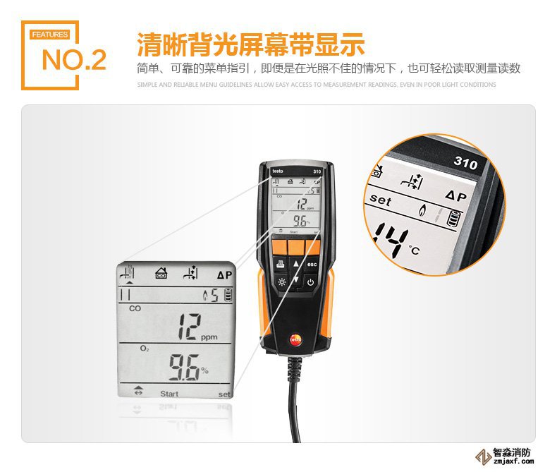 testo 310煙氣分析儀操作簡便,內(nèi)置4個引導(dǎo)式測量菜單:煙氣測量,抽力測量,環(huán)境CO測量以及差壓測量。帶背光大顯示屏,適用于各種照明條件情況。